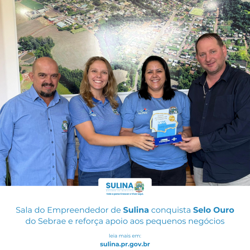 A Sala do Empreendedor de Sulina foi reconhecida com o Selo Ouro, certificação de excelência concedida pelo Sebrae às unidades que atingem altos padrões de qualidade no atendimento aos micro e pequenos empreendedores. No Paraná, para conquistar o Selo Ouro, é necessário alcançar pontuação superior a 91 pontos, índice que comprova a eficiência e o comprometimento do serviço prestado.