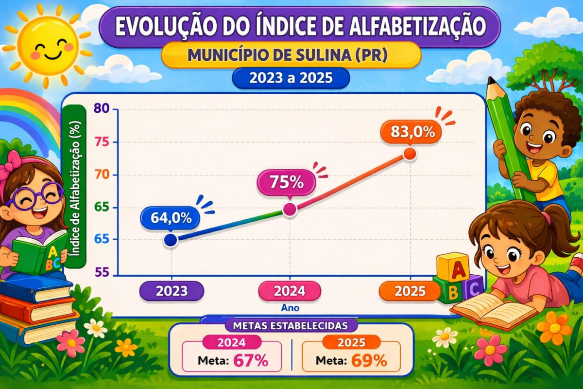 A Prefeitura Municipal de Sulina através da Secretaria Municipal de Educação, Cultura e Esporte celebra com grande satisfação os avanços alcançados nos índices de alfabetização do município nos últimos anos. Os resultados demonstram o compromisso contínuo com a qualidade da educação e o desenvolvimento das nossas crianças. Em 2023, o município registrou um índice de 64% de alunos alfabetizados. Já em 2024, esse número avançou para 75%, evidenciando uma evolução significativa. Para 2025, a projeção é ainda mais positiva, com expectativa de alcançar 83%, consolidando sulina como referência no fortalecimento da aprendizagem na idade certa. Esses resultados são fruto de um trabalho coletivo, planejado e comprometido. Destacamos e agradecemos, de forma especial, o empenho dos professores, que diariamente se dedicam com responsabilidade, carinho e profissionalismo para garantir que cada aluno tenha acesso ao conhecimento e desenvolva plenamente suas habilidades com qualidade e equidade. Reconhecemos também o papel fundamental da equipe pedagógica, gestores escolares, servidores da educação e das famílias, que caminham juntos nesse processo de transformação. A Prefeitura Municipal de Sulina reafirma seu compromisso com a educação, investindo em ações, formação continuada e estratégias que garantam avanços cada vez maiores na alfabetização.